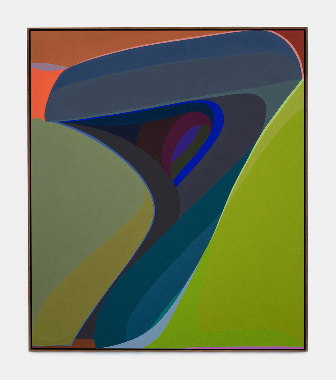 Brian Sanchez explores abstraction through a bold interplay of robust shapes, detailed line work, and contrasting deep hues. His paintings deconstruct simple forms, as organic bands of complementary tones nestle against each other, coalescing into dynamic compositions. Sanchez activates space through a nuanced understanding of color relationships, creating dialogues between multiple equally vibrant hues. His intense palette provokes raw, unbridled emotions that reflect the complex interiority of our lives.