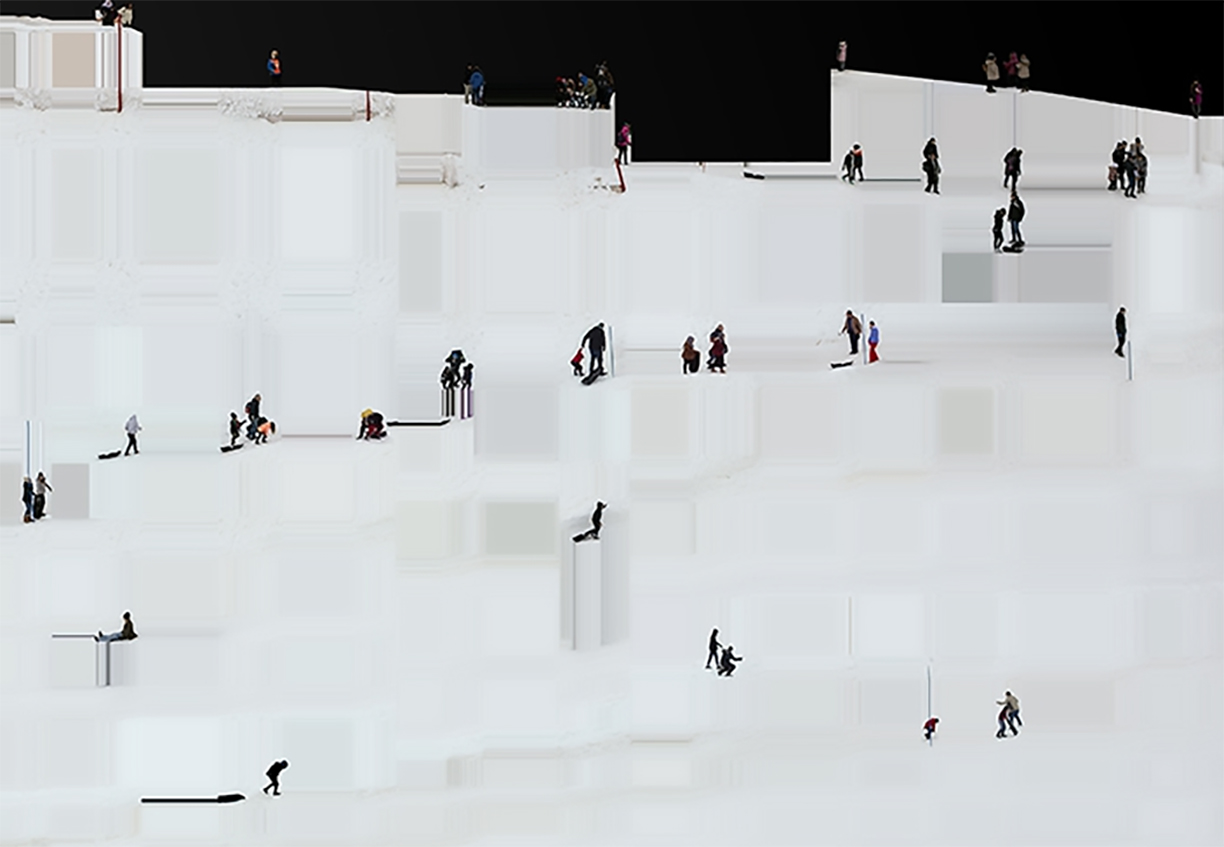 Asaf Gam Hacohen digitally manipulates photographs of vibrant, familiar scenes, flattening them to near abstraction. As you move closer into the image, architecture and figures become more apparent, giving life and energy to the compositions. Hacohen plays with the idea of memory, observation and the digital feed of our reality.