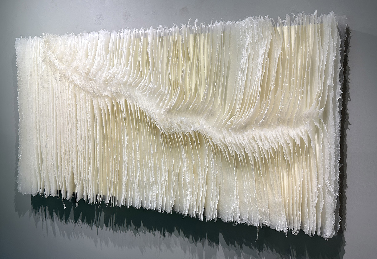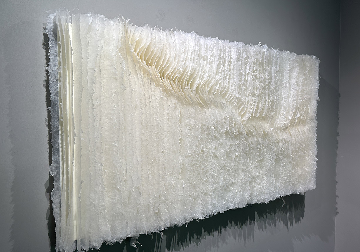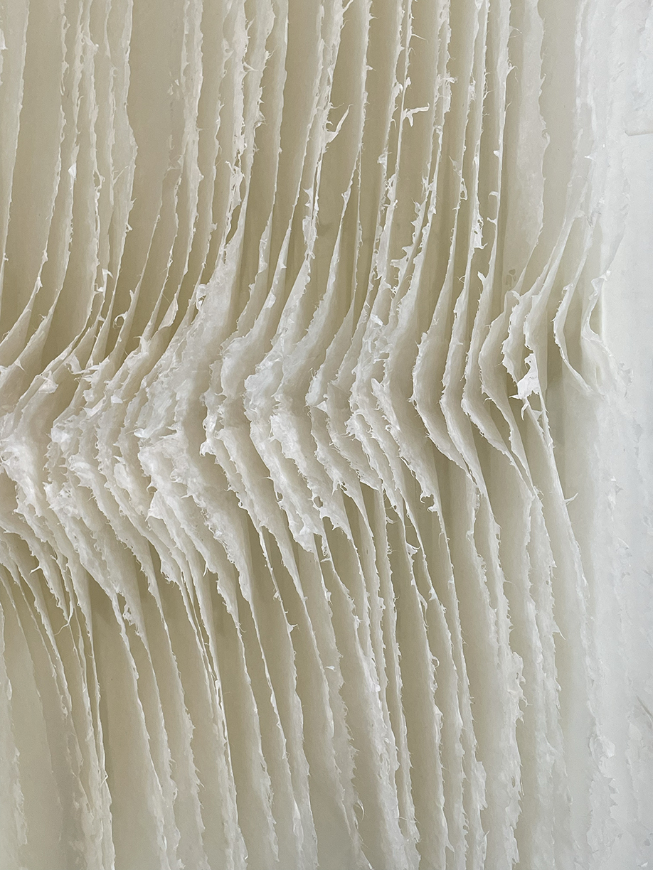 Kandis Susol’s encaustic paper sculptures engage with the inherent complexity of all of life's imperfections. Each unique, handmade sheet creates a dialogue with the next, both highlighting and obscuring certain inconsistencies while flowing together as a cohesive unit. These differences inform our own placement in the world. Taken together, the wax-coated papers ripple and dance with a tension that fluctuates with every new perspective.