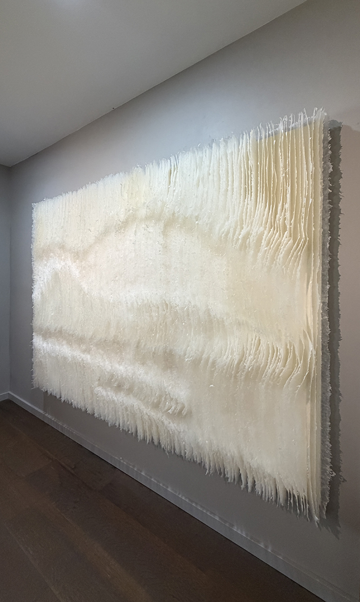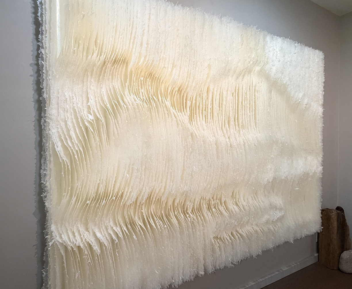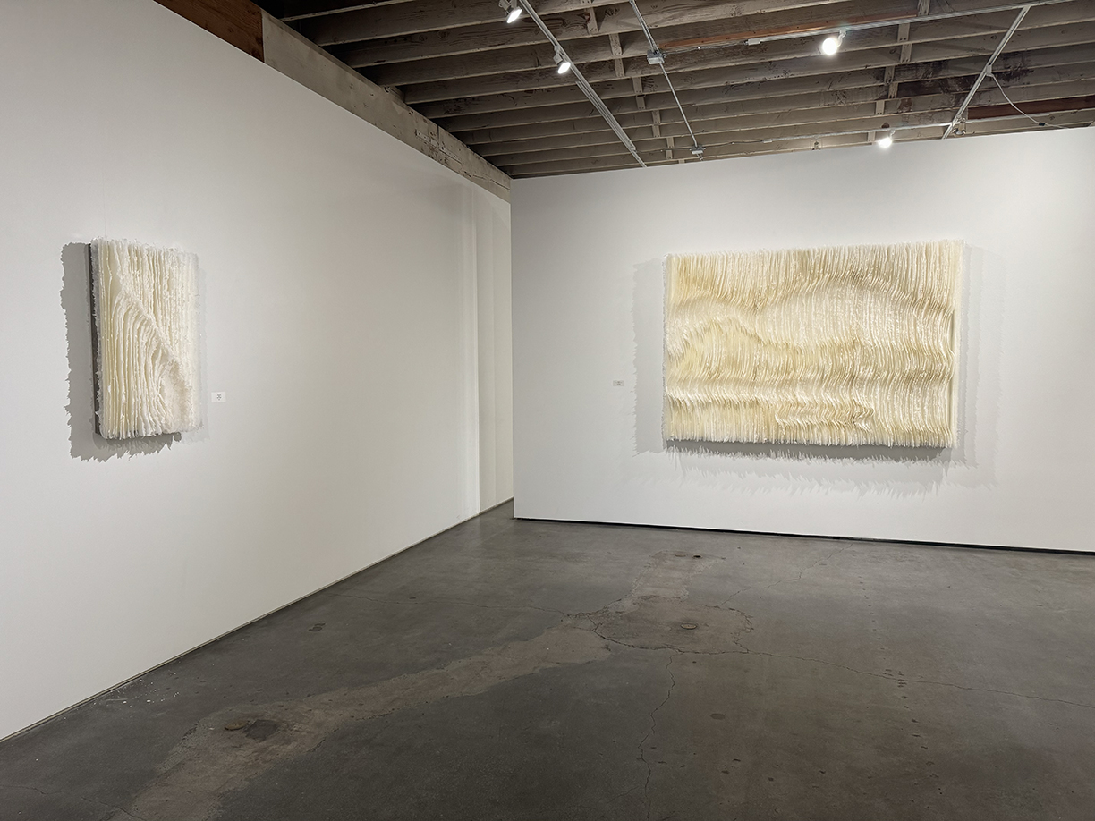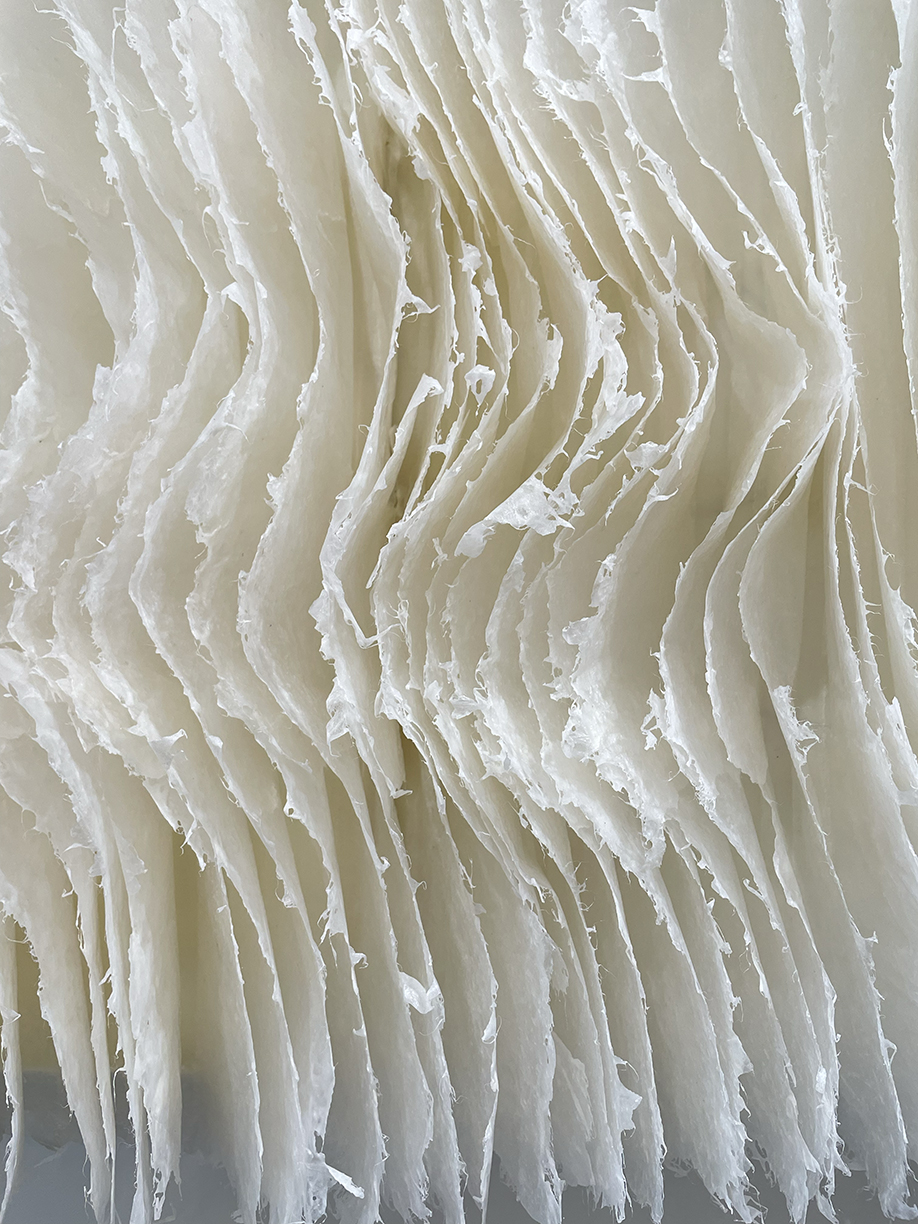 Kandis Susol’s encaustic paper sculptures engage with the inherent complexity of all of life's imperfections. Each unique, handmade sheet creates a dialogue with the next, both highlighting and obscuring certain inconsistencies while flowing together as a cohesive unit. These differences inform our own placement in the world. Taken together, the wax-coated papers ripple and dance with a tension that fluctuates with every new perspective.