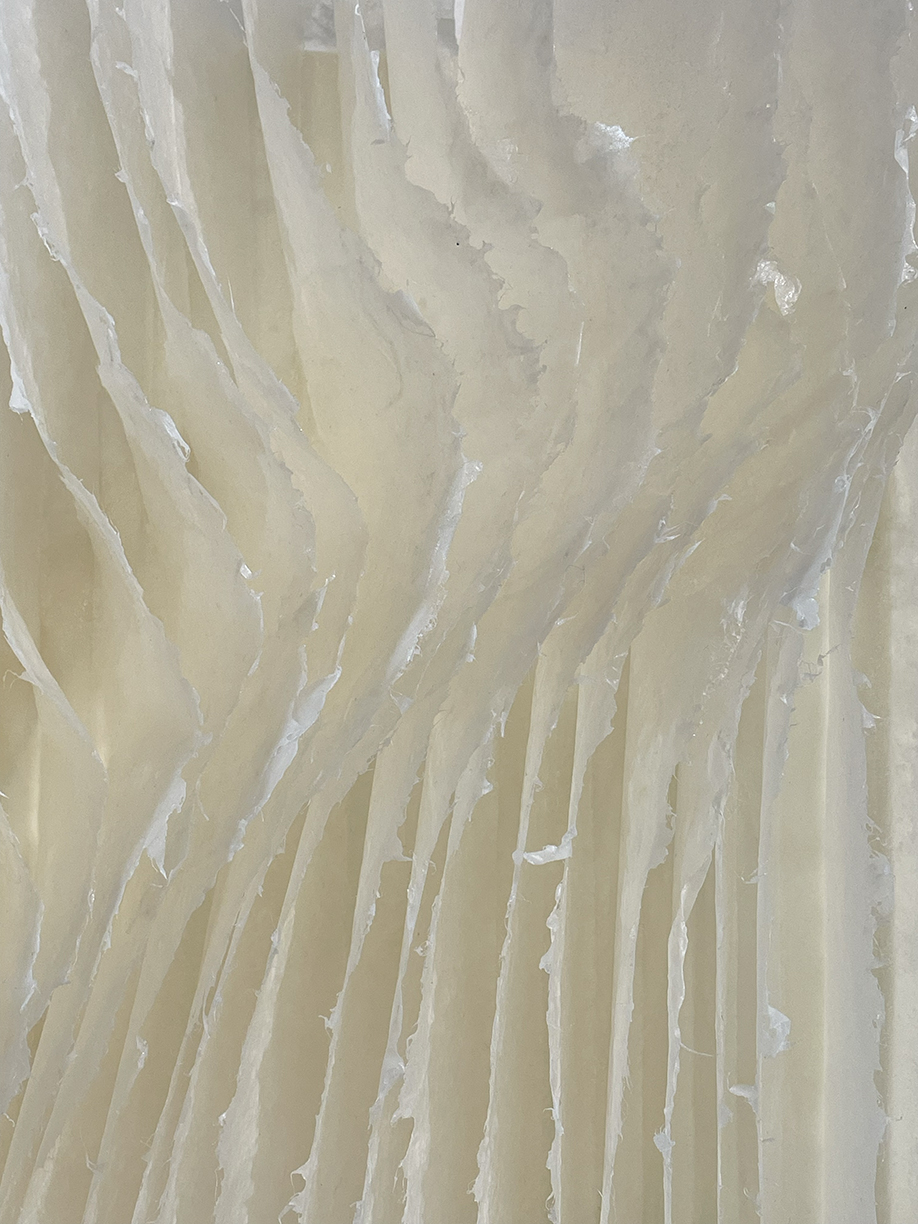 Kandis Susol’s encaustic paper sculptures engage with the inherent complexity of all of life's imperfections. Each unique, handmade sheet creates a dialogue with the next, both highlighting and obscuring certain inconsistencies while flowing together as a cohesive unit. These differences inform our own placement in the world. Taken together, the wax-coated papers ripple and dance with a tension that fluctuates with every new perspective.