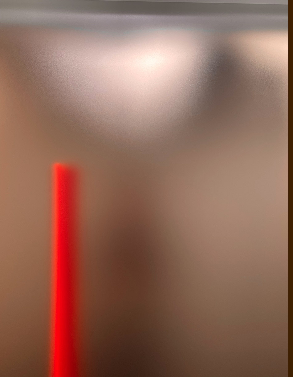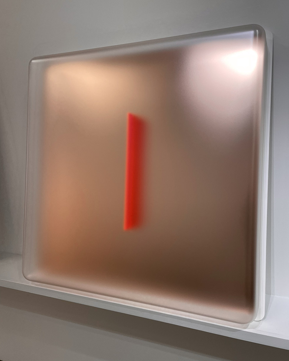 A slim bar of neon color cuts through the picture plane, acting as both a grounding force and a disruption, heightening the interplay of light and depth. Brindle’s use of repetition and saturated color creates a distinctive visual language, inviting contemplation on perception and experience. The sharp geometry of his compositions contrasts with the sensuous, atmospheric glow of color, generating a tension between structure and fluidity. In this space between reality and illusion, the finite and the infinite, Glyphs presents a mesmerizing exploration of form, light, and the ineffable.