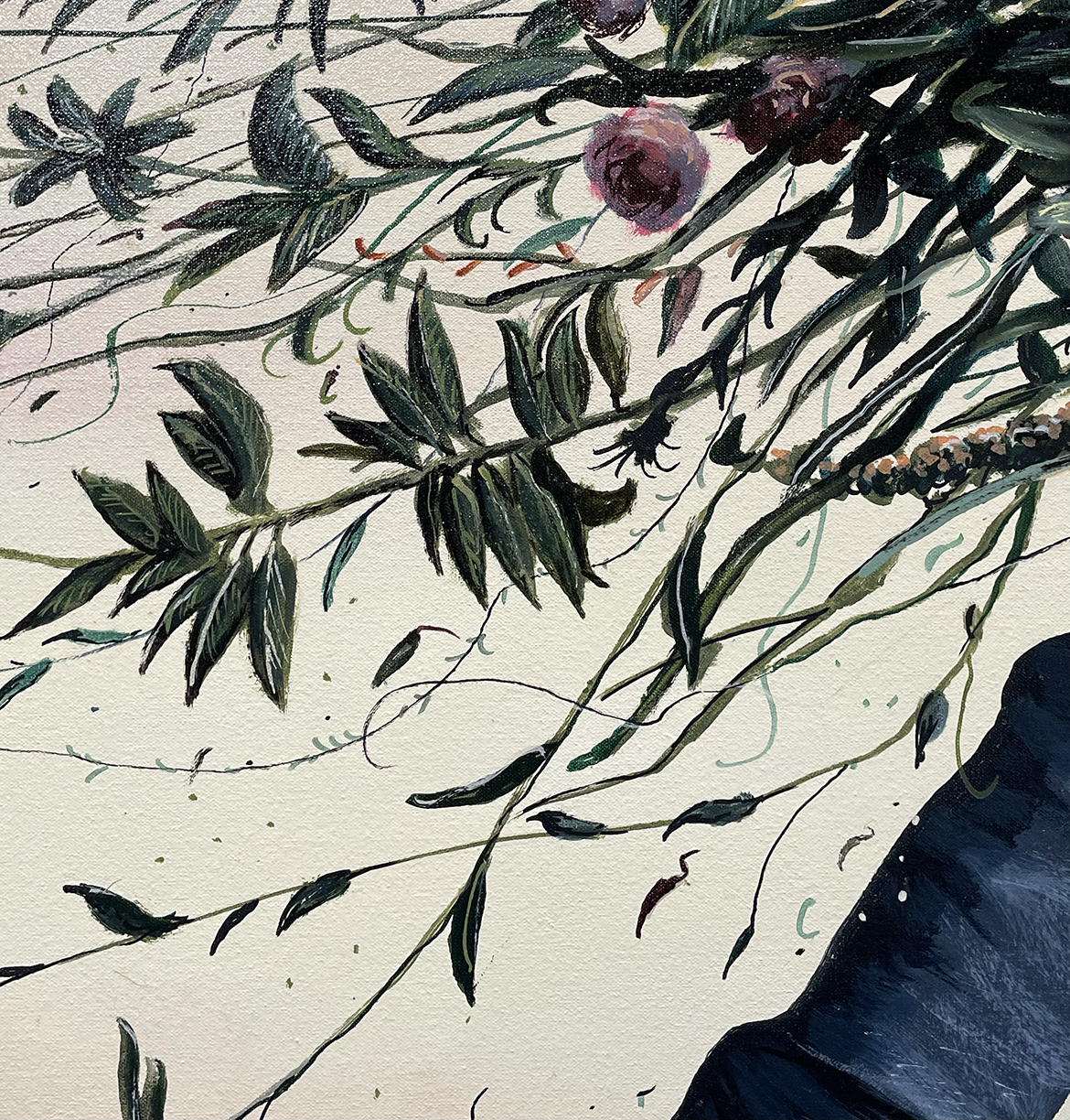 Murrow's recent paintings on high flow acrylic expand on the opulent detail of his work on paper. Paying homage to the Hudson River School Painters and Grant Wood, Murrow treats the natural scenery as a forceful catalyst for his characters' endeavors. Bouquets and roaring waves glimmer with an uncanny vibrancy, mirroring the surrealist bent of his narratives. The use of color brings a heightened theatricality to the already whimsical scenes, which oftentimes originate from staged photography shoots. Murrow seamlessly blends the believable with the extraordinary, creating alchemy out of the mundane.