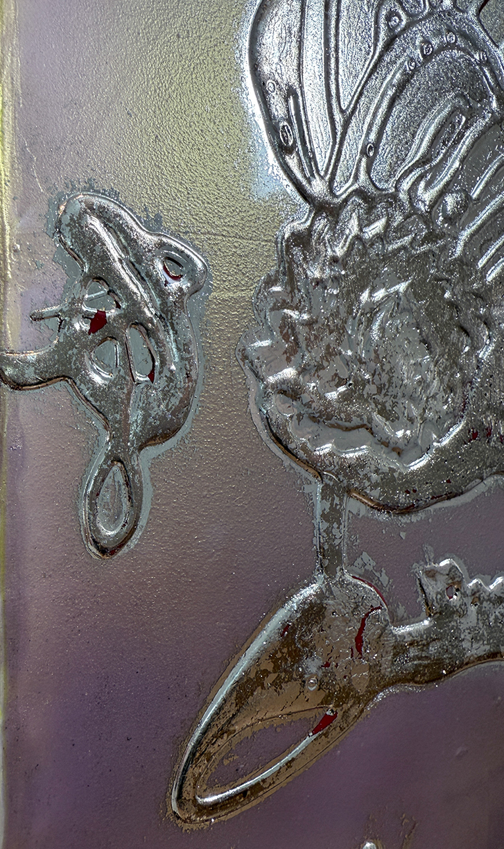 Catherine Howe insists that her paintings, which appear to reference 17th-century still life paintings, are not about representation or narrative; rather, she says they are exercises in the evocative power of painting as a material. What appear to be flora, figures, and foods dissolve into abstract flurries of brush marks and fields of commingled colors when observed closely. The painted surfaces vary widely in paint application, with some areas thinly glazed or quickly sketched, and others so thick they appear to be in relief. Howe’s palette is known to be strong and vibrant, though not without eerie contrasts; her technique includes splatters, spills, and the scraping away of paint.