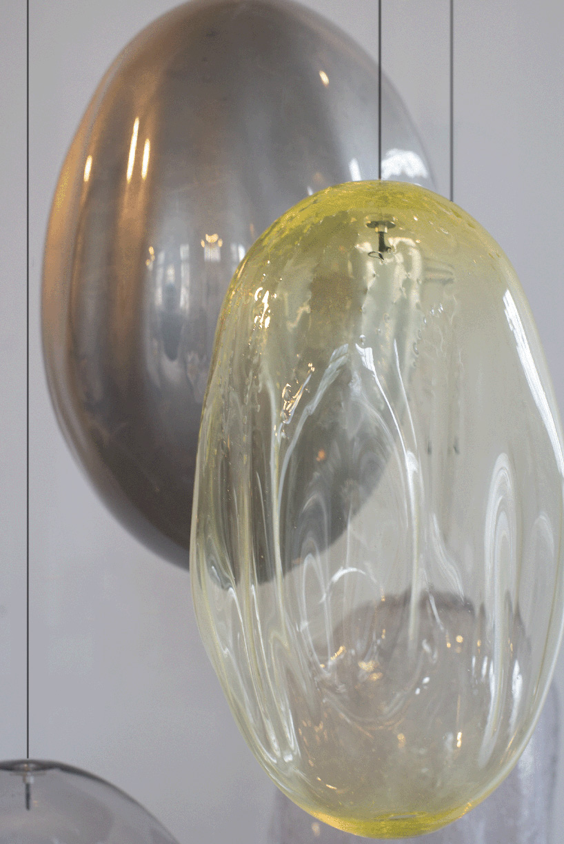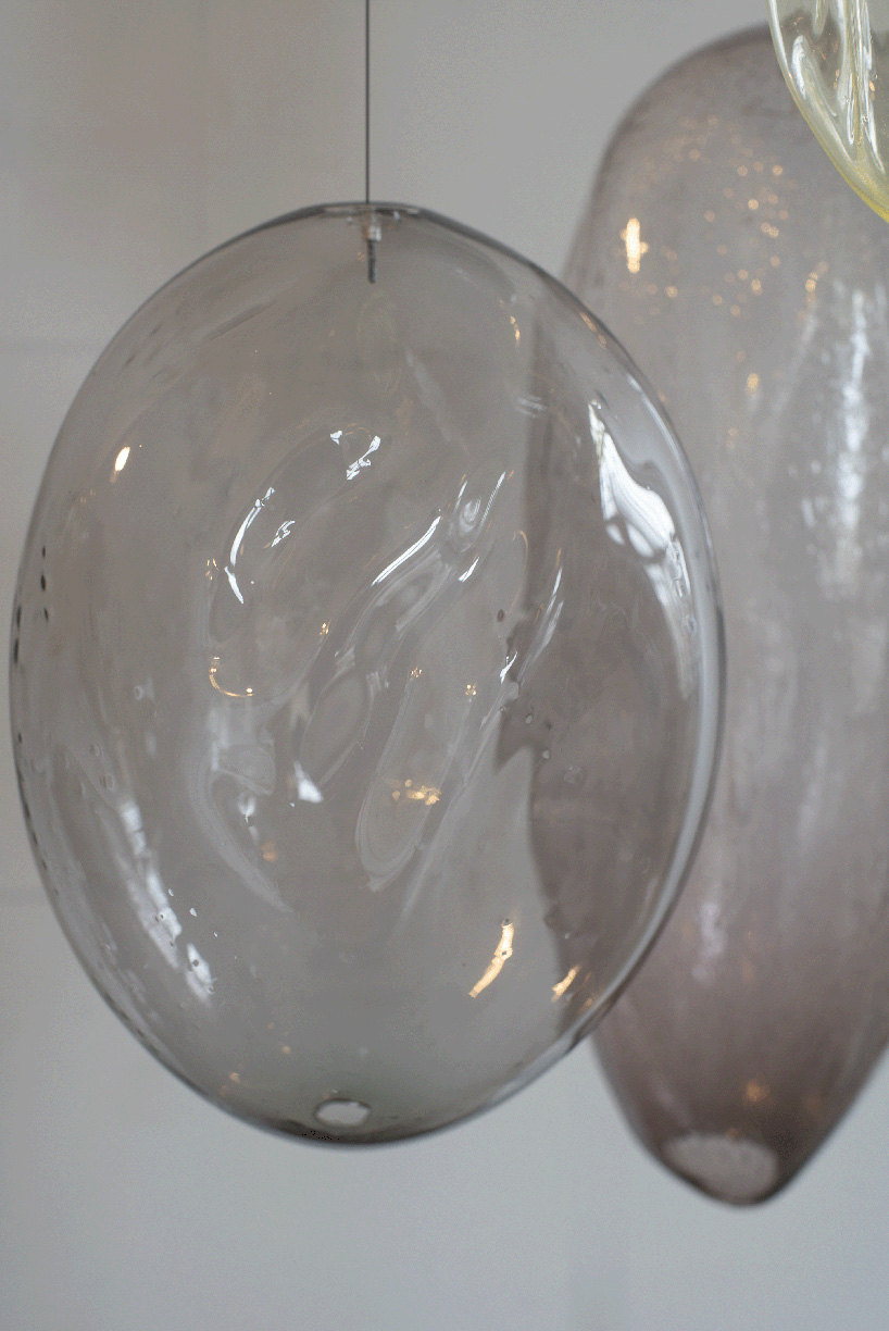 After her recent residency at the Museum of Glass, multi-media artist Ann Gardner has returned to her roots. Inspired by the large amount of time she spends in the water, she sought to create bubble like forms. They are intentionally imperfect, as is nature, and created with breath, another element essential to sustaining life. These hanging forms remind her of the purity and simplicity she finds in glass, and the effortlessness way the medium helps her to express herself.