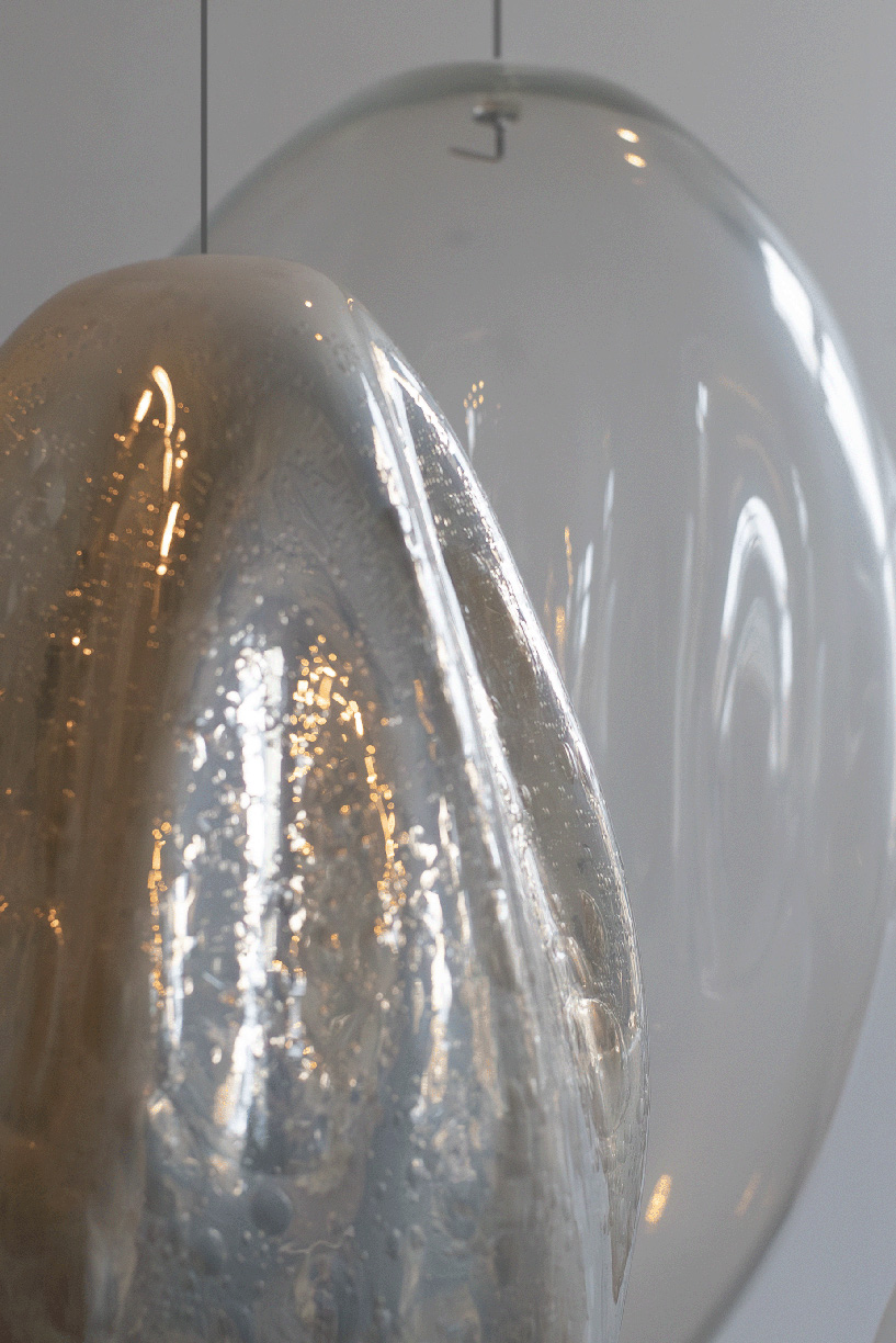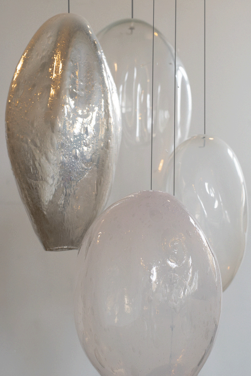 After her recent residency at the Museum of Glass, multi-media artist Ann Gardner has returned to her roots. Inspired by the large amount of time she spends in the water, she sought to create bubble like forms. They are intentionally imperfect, as is nature, and created with breath, another element essential to sustaining life. These hanging forms remind her of the purity and simplicity she finds in glass, and the effortlessness way the medium helps her to express herself.