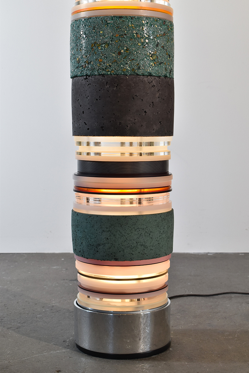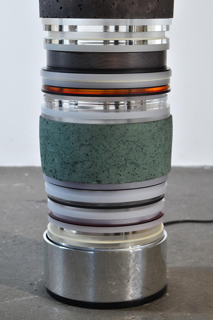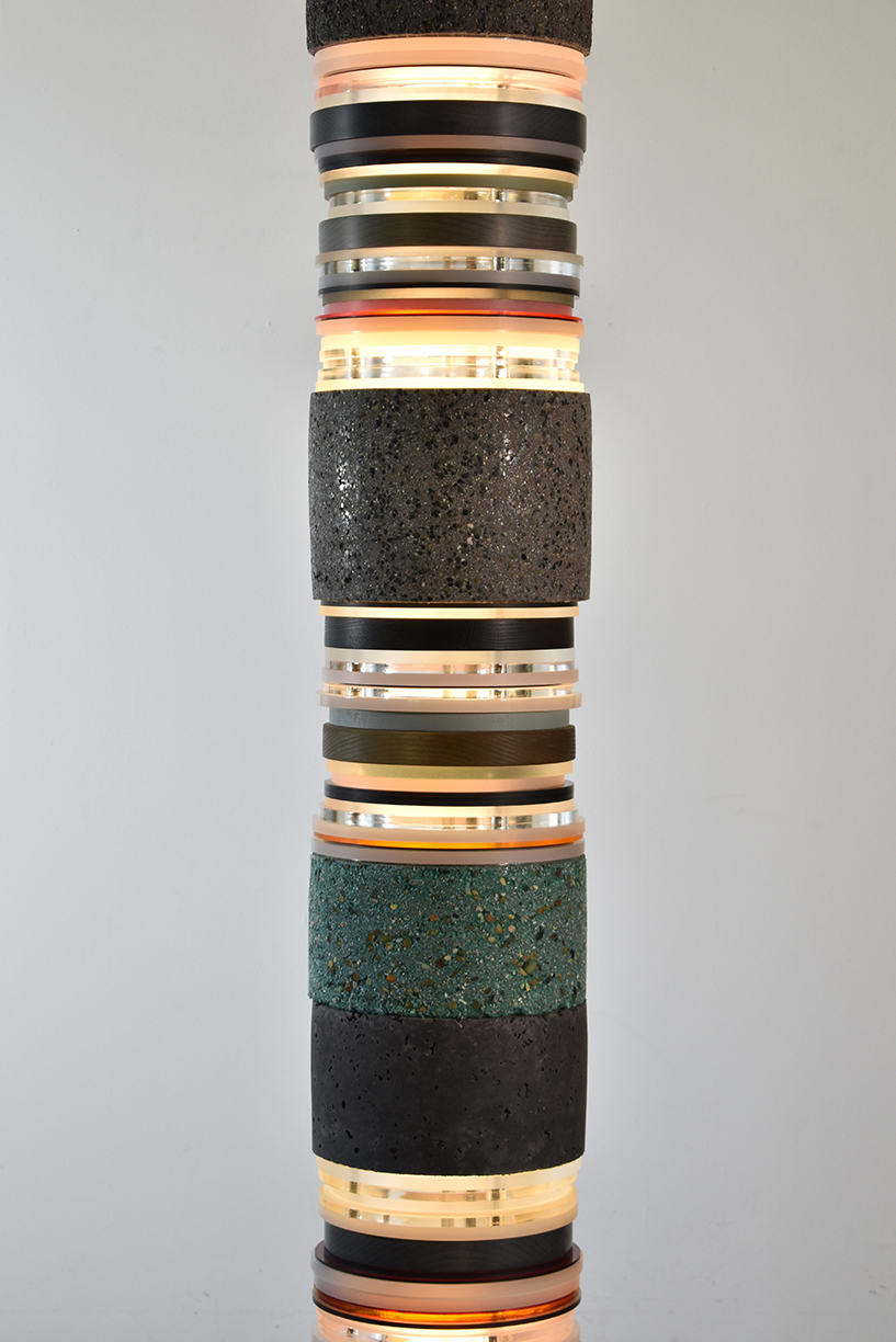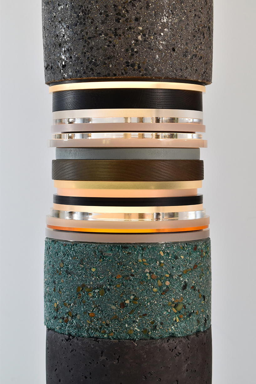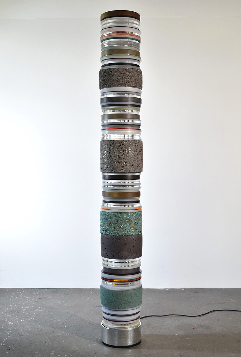 Matt Gagnon's Light Stack sculptures are an ongoing exploration of the artist's fascination with the transformative quality of light, and how materials and surroundings impacts theses changes. His totemic works incorporate oak, pine, concrete, brass, polished aluminum and painted MDF. Each layered piece offers an interaction with the central lighting source, "holding" and defining the light in a unique way.