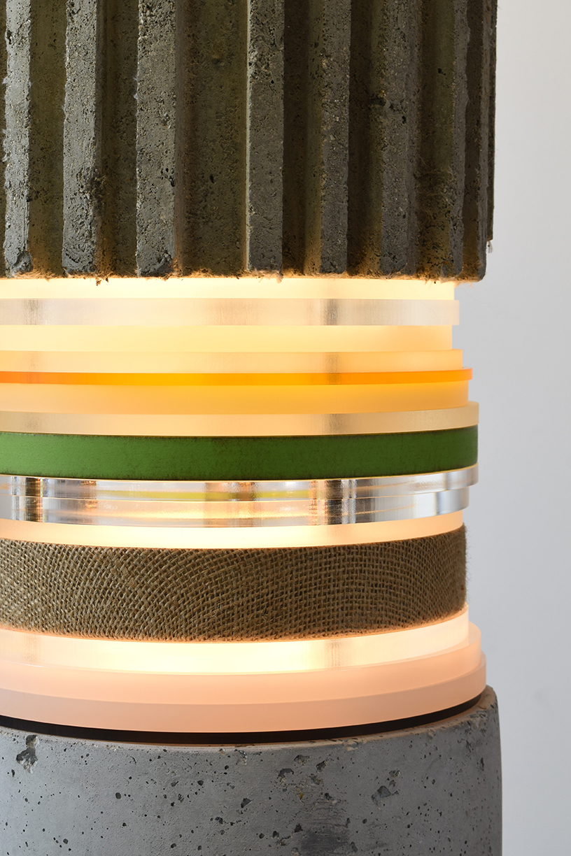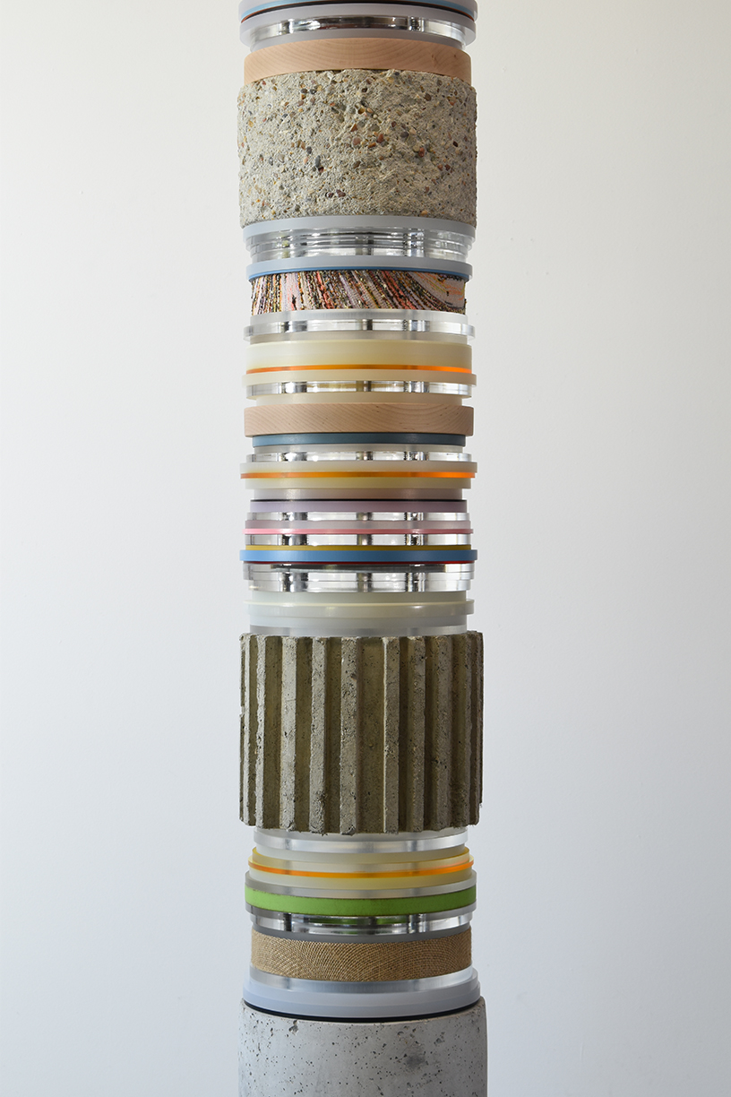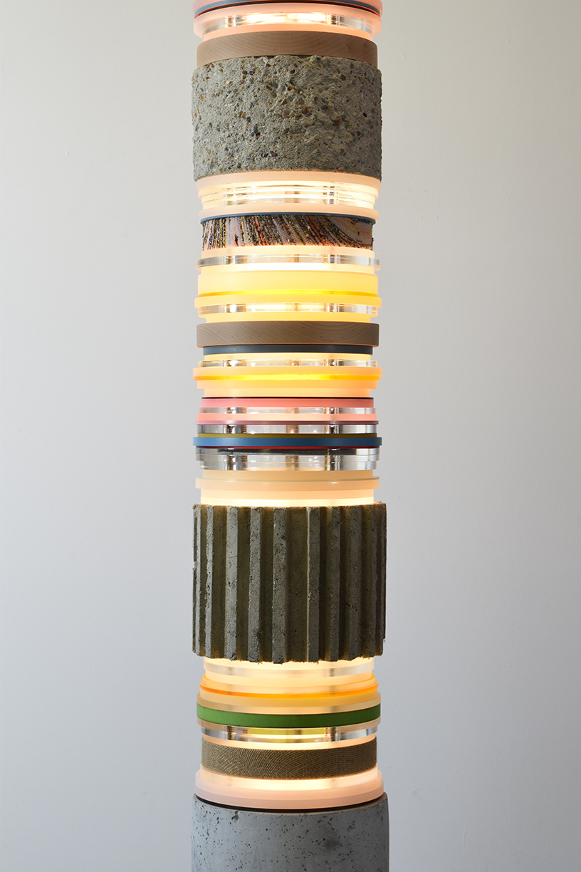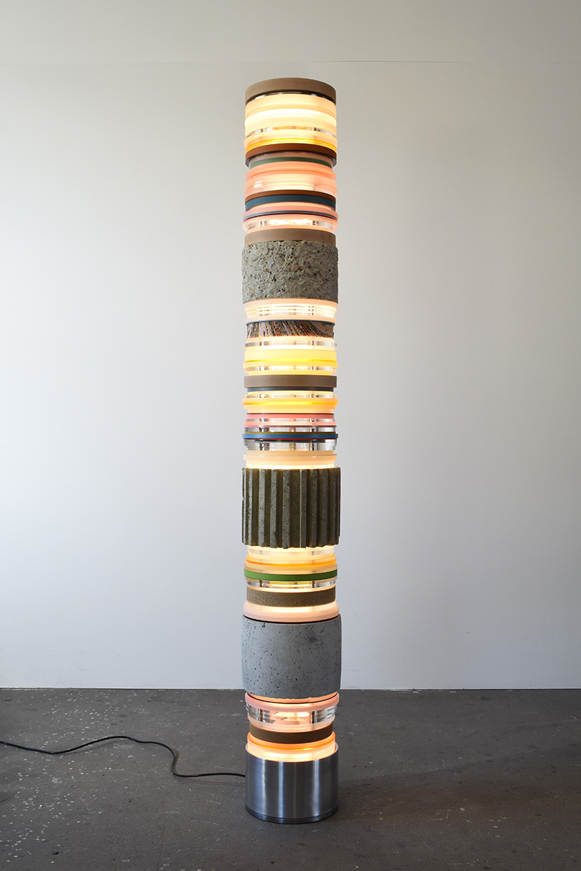Matt Gagnon's Light Stack sculptures are an ongoing exploration of the artist's fascination with the transformative quality of light, and how materials and surroundings impacts theses changes. His totemic works incorporate oak, pine, concrete, brass, polished aluminum and painted MDF. Each layered piece offers an interaction with the central lighting source, "holding" and defining the light in a unique way.