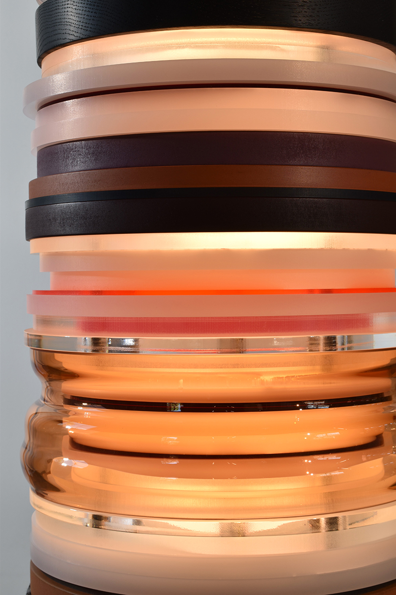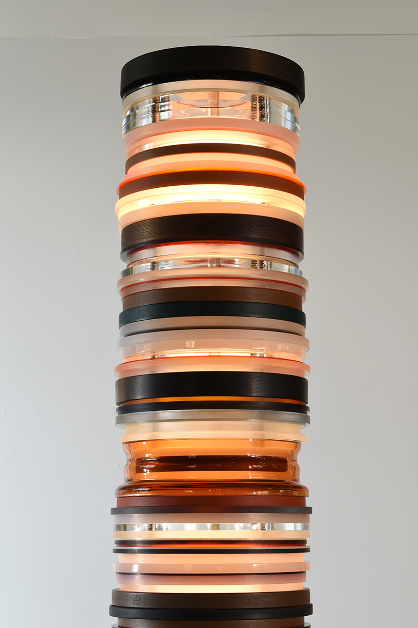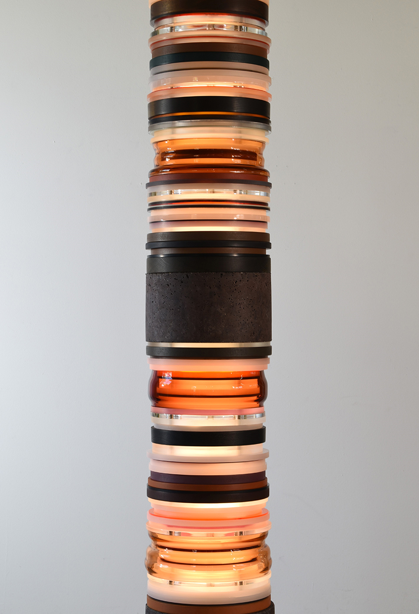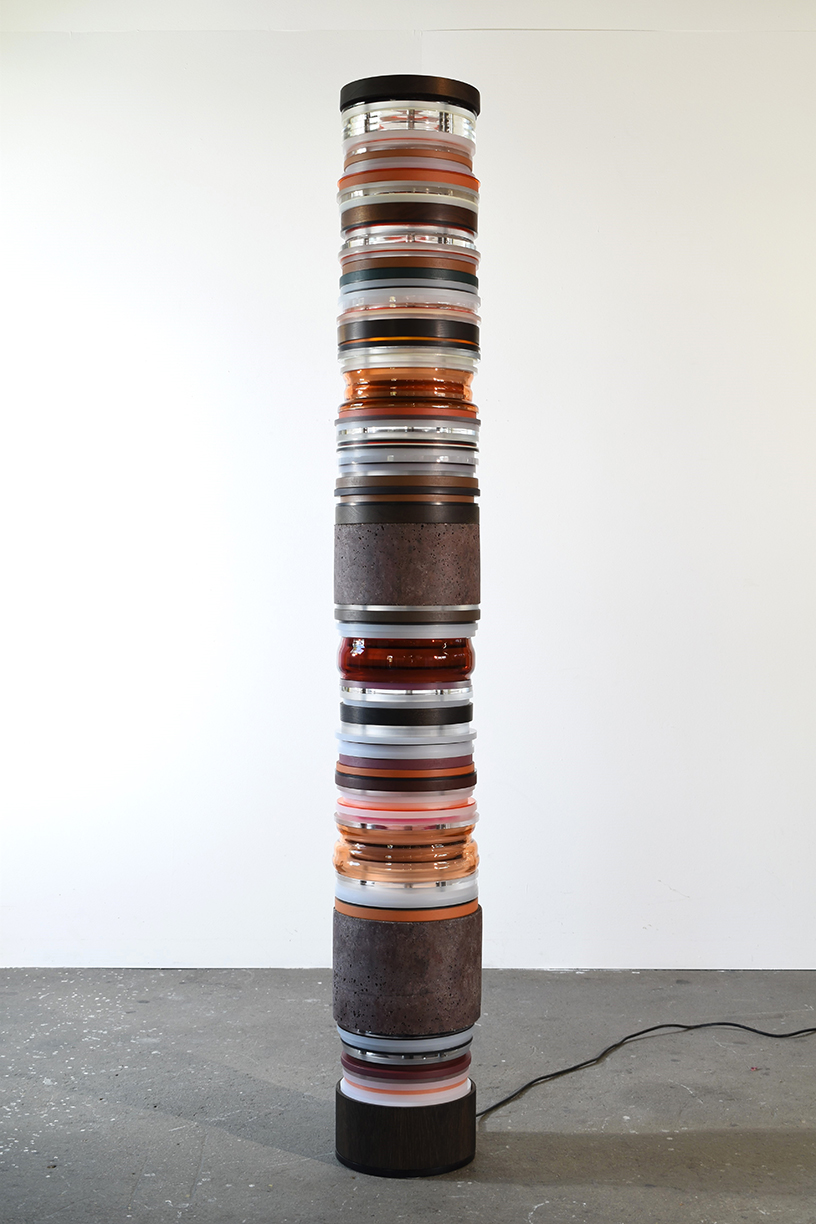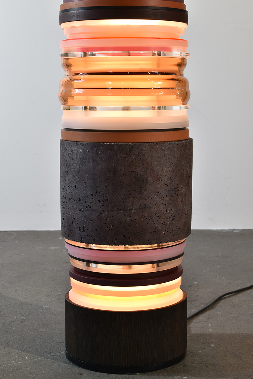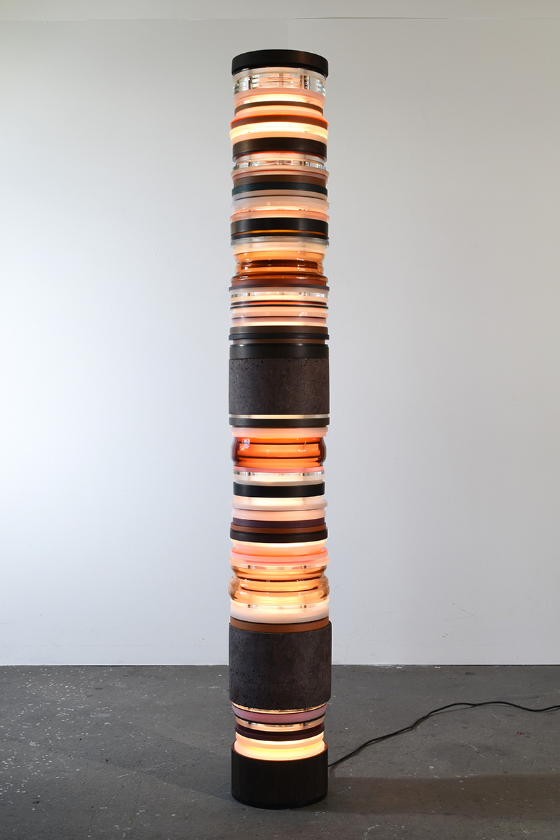 Matt Gagnon's Light Stack sculptures are an ongoing exploration of the artist's fascination with the transformative quality of light, and how materials and surroundings impacts theses changes. His totemic works incorporate oak, pine, concrete, brass, polished aluminum and painted MDF. Each layered piece offers an interaction with the central lighting source, "holding" and defining the light in a unique way.