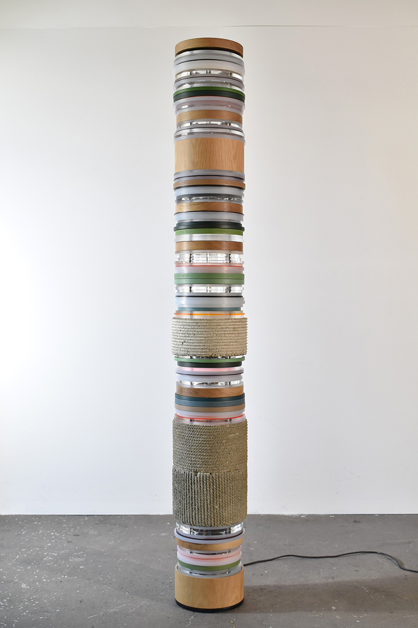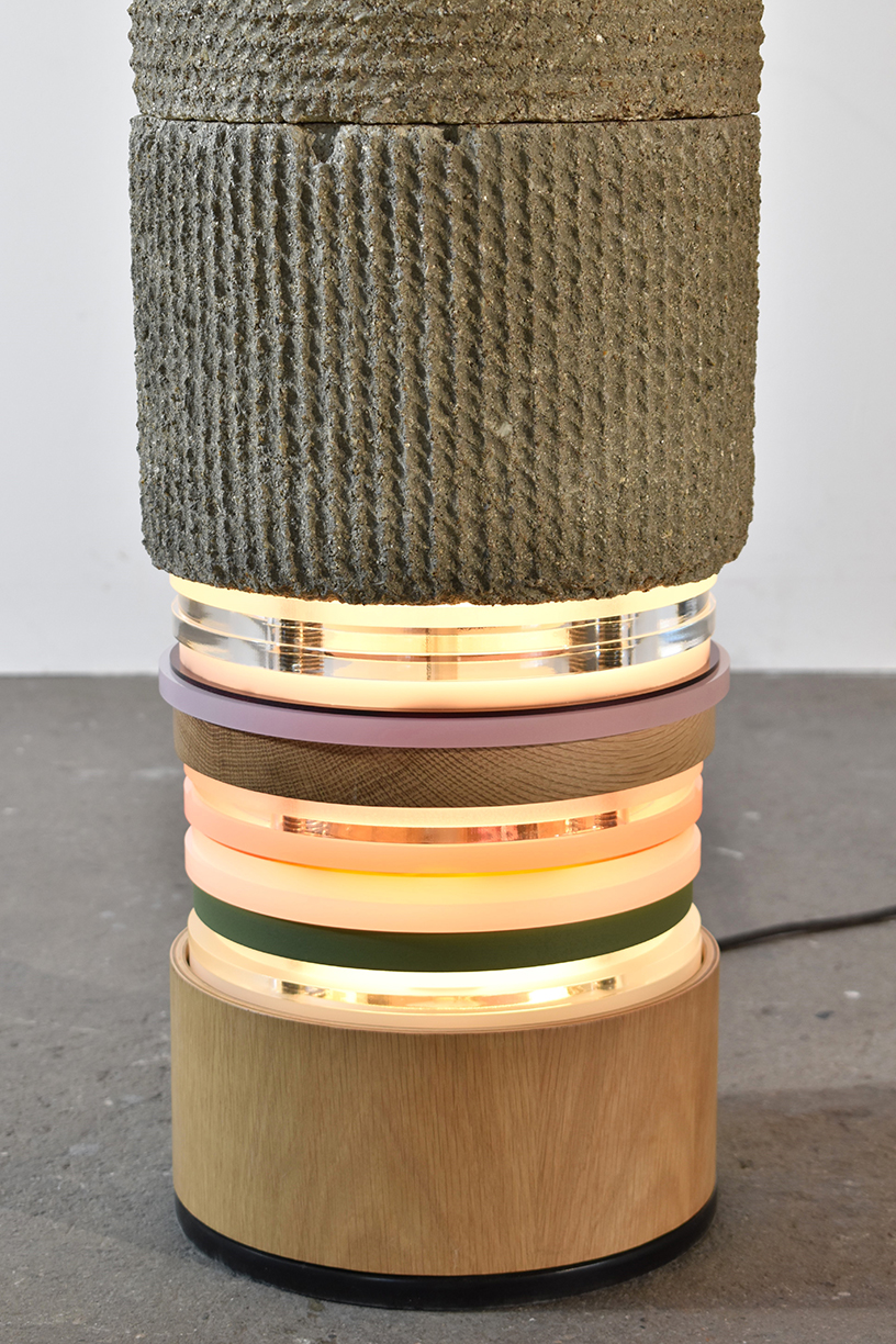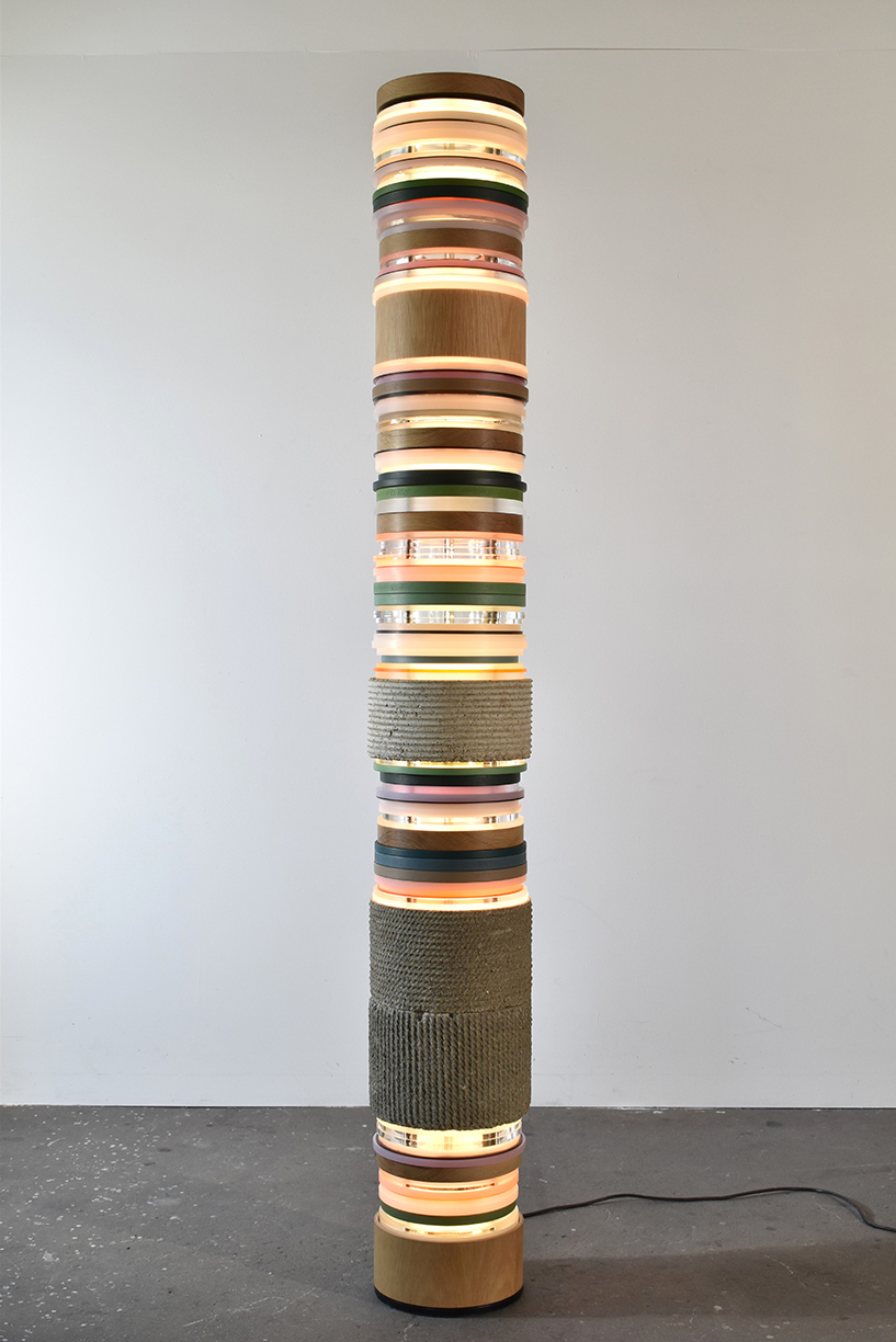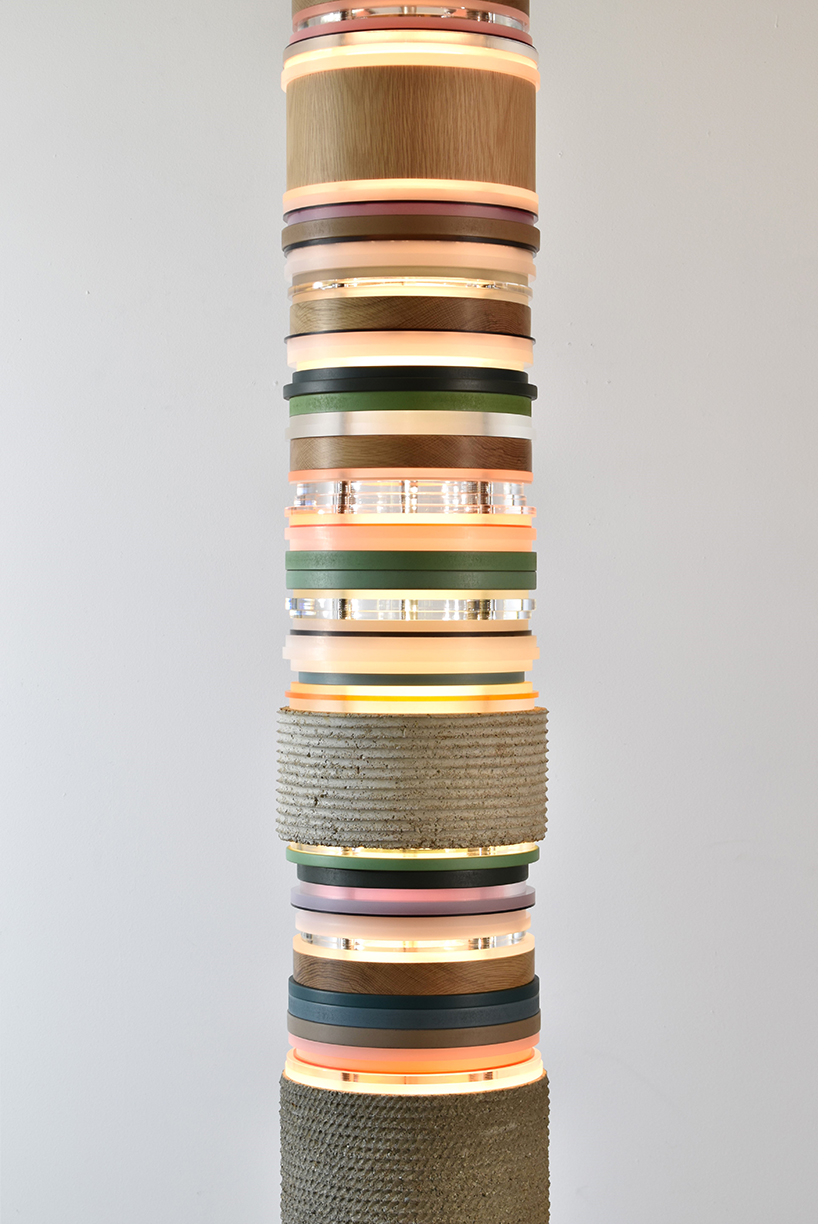 Matt Gagnon's Light Stack sculptures are an ongoing exploration of the artist's fascination with the transformative quality of light, and how materials and surroundings impacts theses changes. His totemic works incorporate oak, pine, concrete, brass, polished aluminum and painted MDF. Each layered piece offers an interaction with the central lighting source, "holding" and defining the light in a unique way.