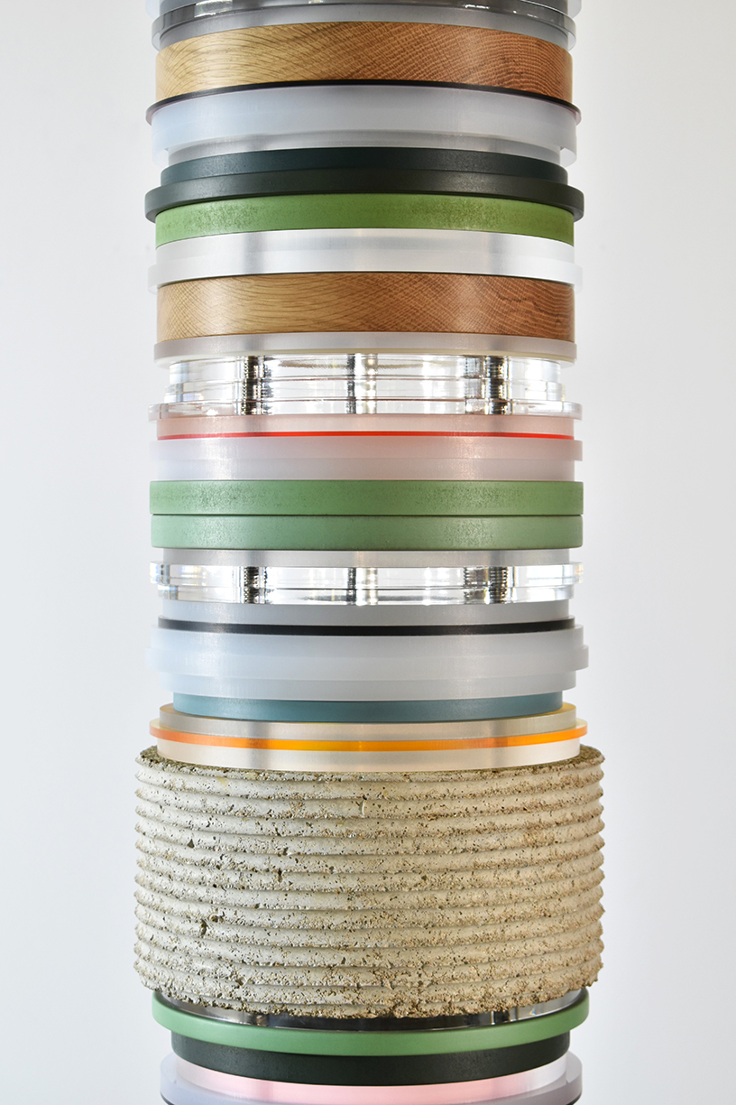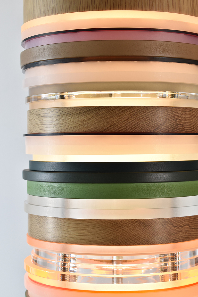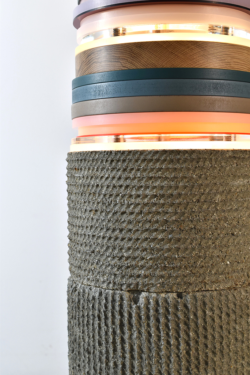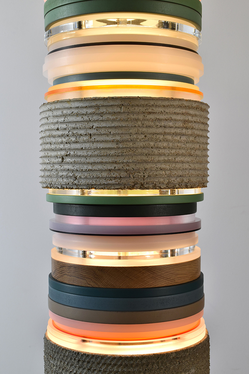 Matt Gagnon's Light Stack sculptures are an ongoing exploration of the artist's fascination with the transformative quality of light, and how materials and surroundings impacts theses changes. His totemic works incorporate oak, pine, concrete, brass, polished aluminum and painted MDF. Each layered piece offers an interaction with the central lighting source, "holding" and defining the light in a unique way.