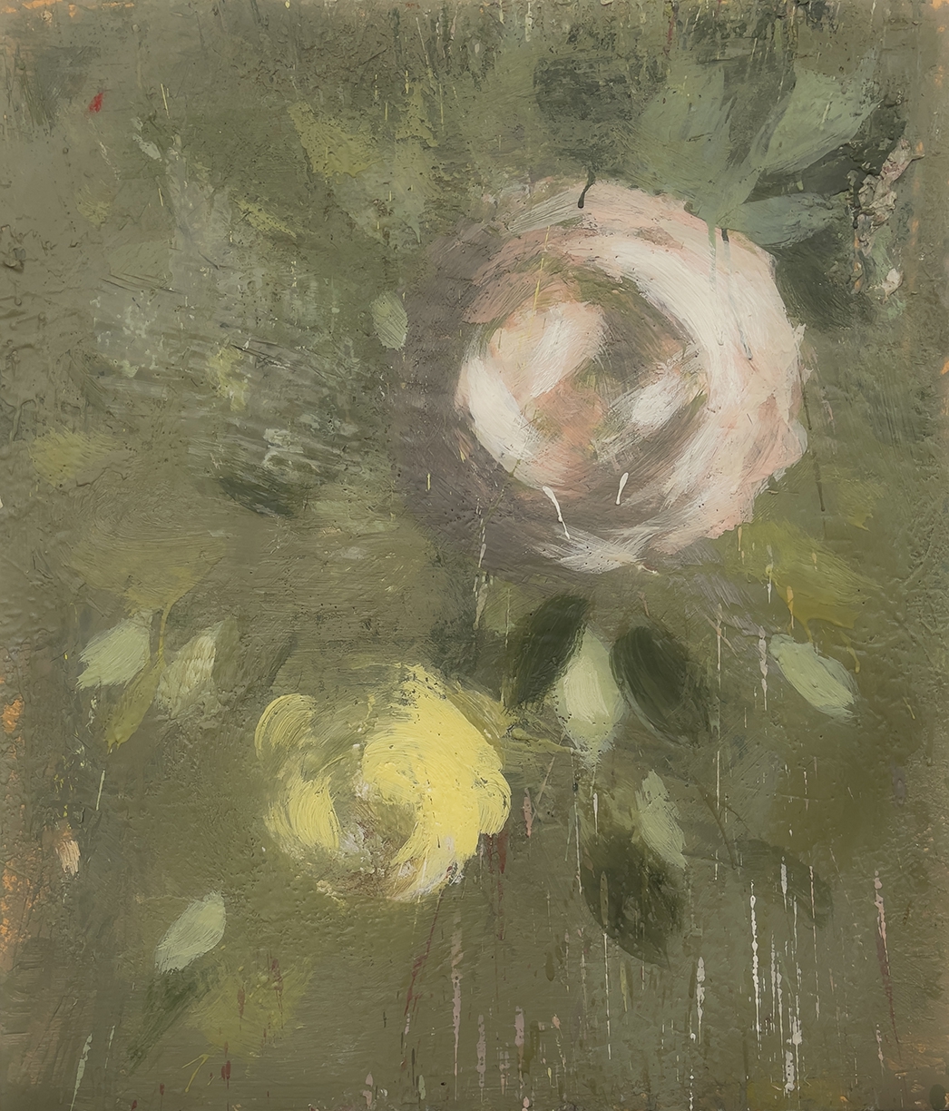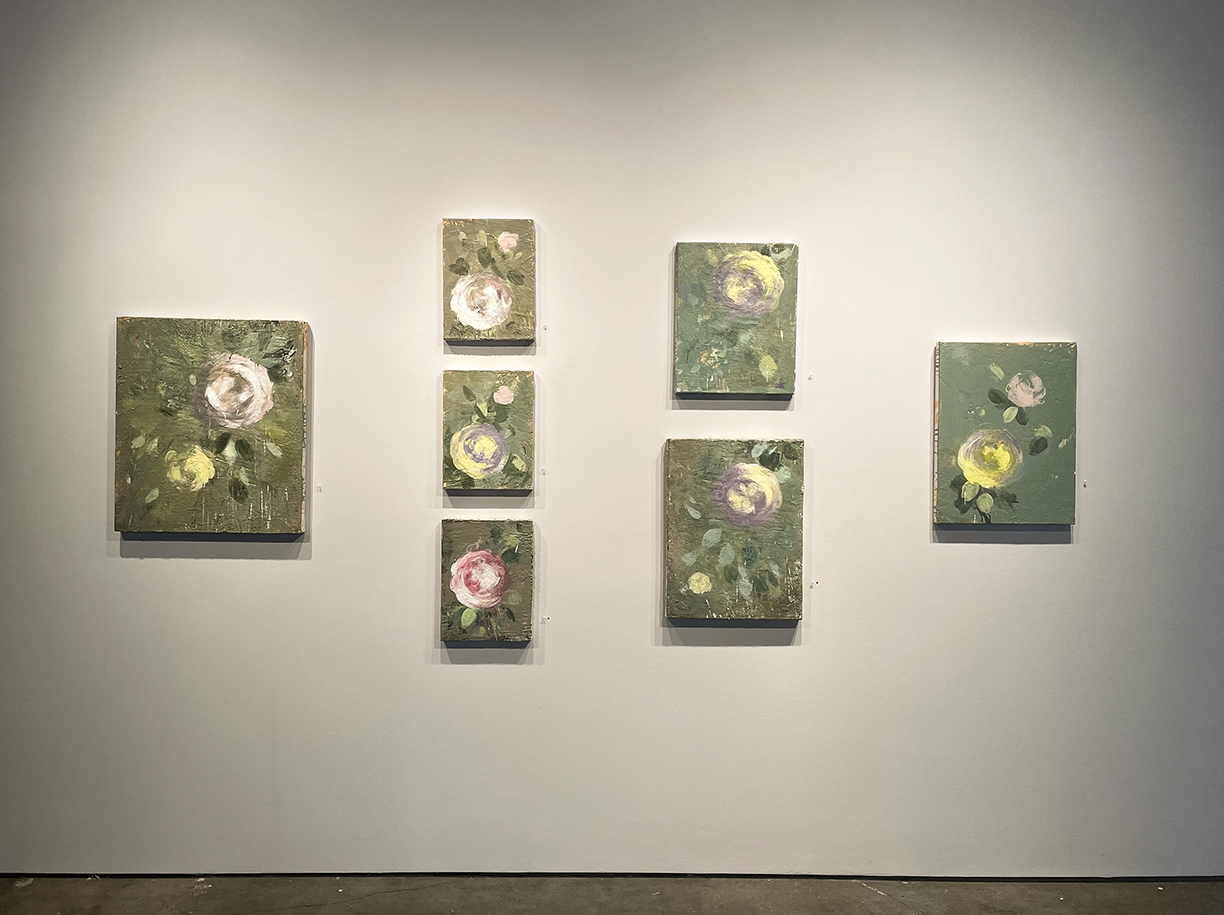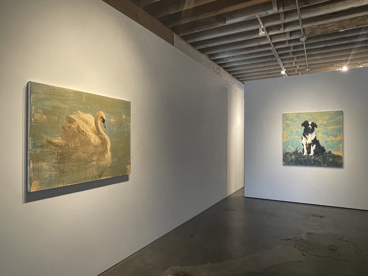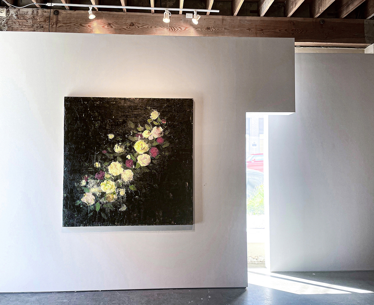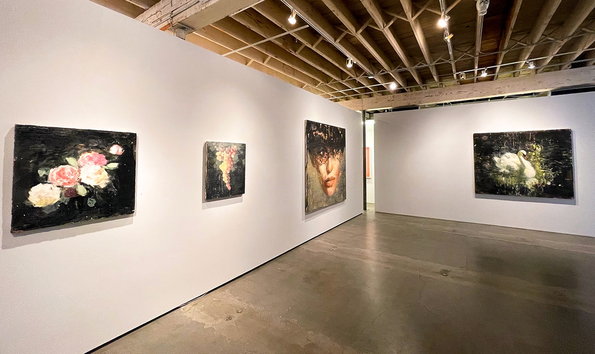 Much of mythology is meant to warn mortals against their folly, however then as now, often the innocent are those weighted with what befalls them. Leda and the Swan is one of the best known tales in Greek and Roman mythology. The god Jupiter/Zeus transforms himself into a swan and rapes or seduces Leda. In much of art history, this is depicted more as a seduction, softening the uncomfortable subject matter. The blame is placed on Leda and her ability to be fooled, rather than depicting her as the victim that she was. In Tony Scherman’s exhibition, The Rape of Leda, Scherman confronts and names the act, forcing us to consider it. We do not see the interaction between the two, rather the approaching god and the cast of silent onlookers (Venus, Persephone, Diana as a stag, Cerberus and others). As in life, bystanders bear witness and cannot find their voices to protest, or at times do not care to. Scherman’s flowers act as symbols of the empathy and protection Leda deserved and was unable to find.